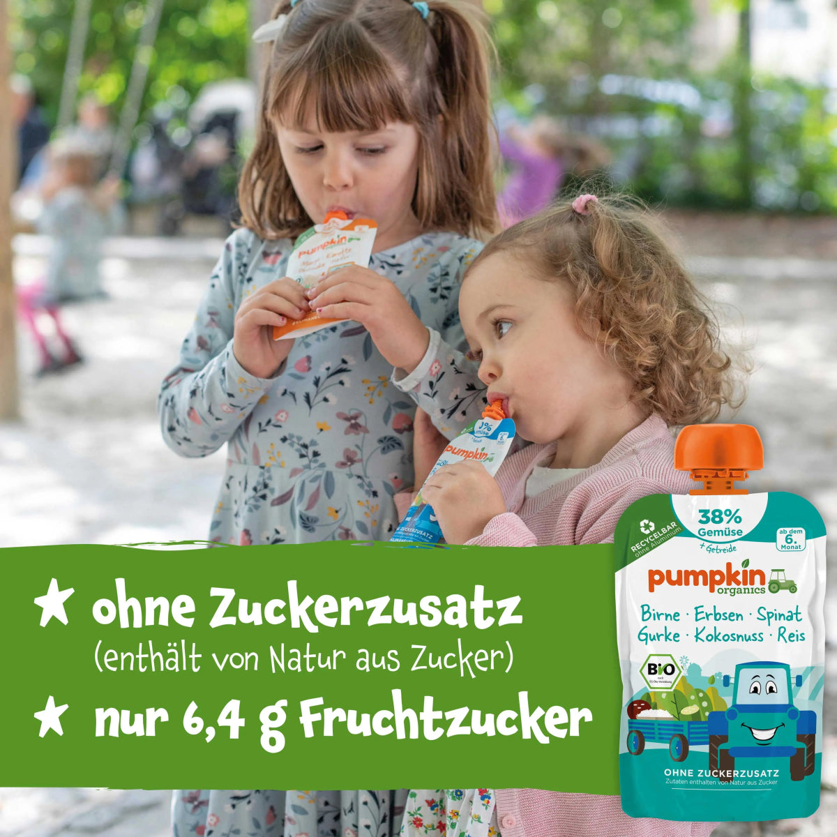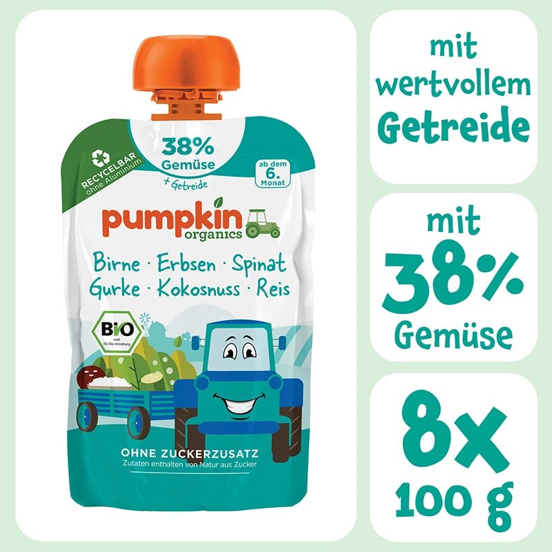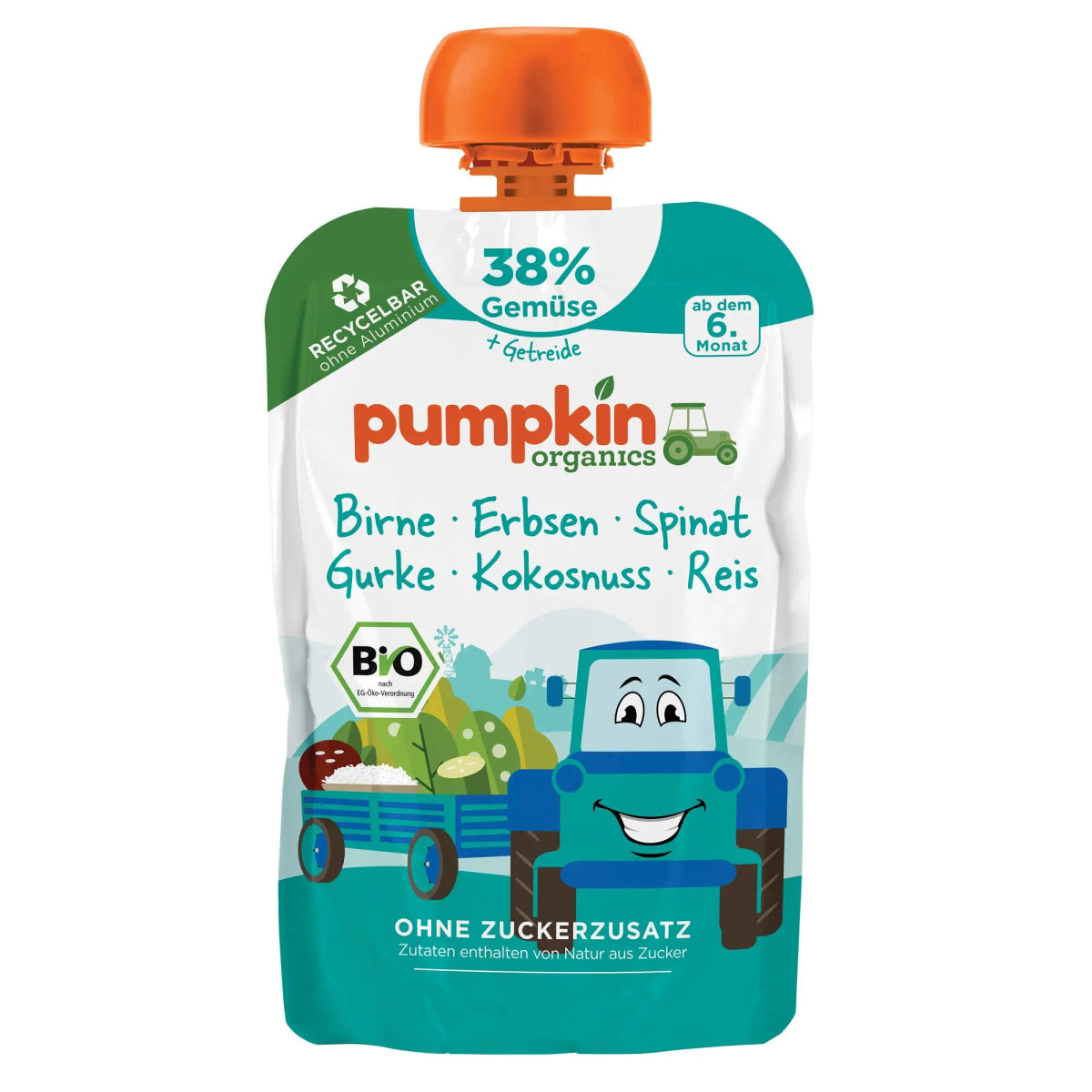 Quetschie mit Birne, Erbsen, Spinat, Gurke, Kokosnuss, Reis