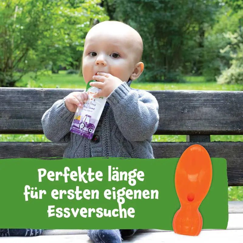 Unser Löffel hat die perfekt abgestimmte Länge und ist an die Anatomie des kleinen Babymundes angepasst. Er ist bissfest, sodass beim Aufbeißen nichts Absplittern kann. So kann dein Baby auch problemlos selbstständig essen. Das Quetschen mit den eigenen Händen macht super viel Spaß und trainiert die Koordination ganz spielerisch.