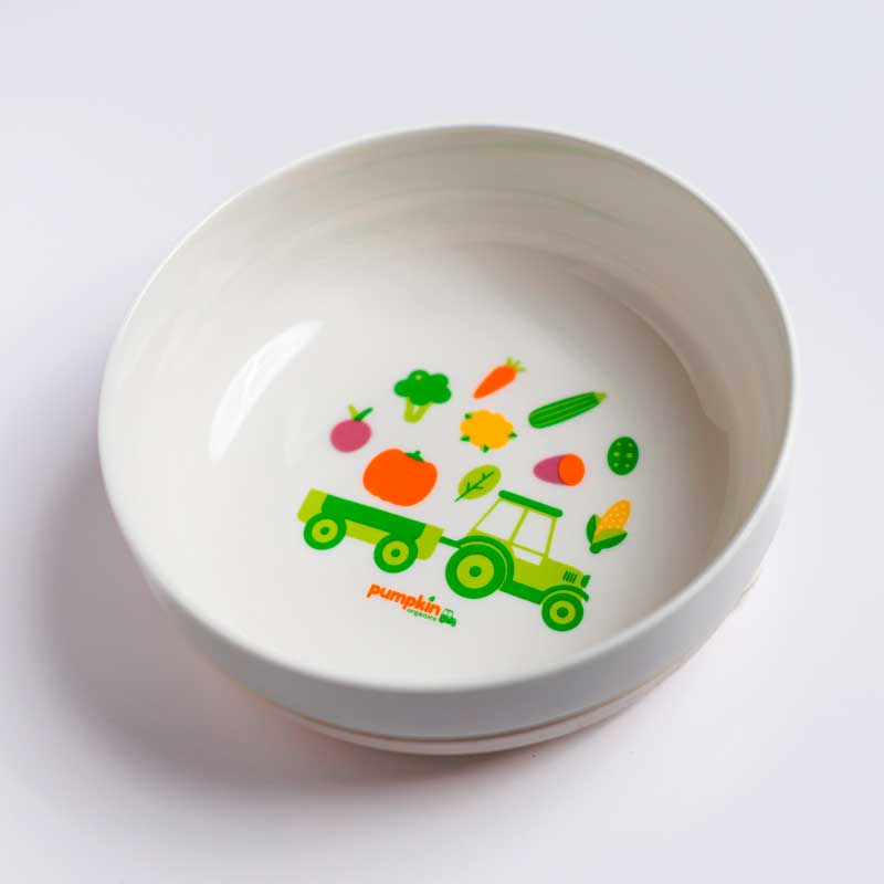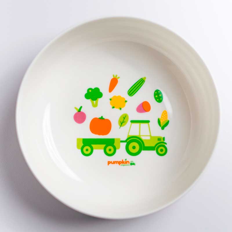 Die kindlich-verspielte Schale der Pumpkin Organics x Kikadu Kollektion macht den Kleinen beim Essenlernen besonders Spaß. Sie ist aus Weichporzellan mit sehr hoher Kantenschlagfestigkeit hergestellt und hat am Boden aufgedruckte Gemüse-Icons. Die dazugehörige Saugmatte aus 100% BPA-freiem Silikon sorgt dafür, dass die Schale nicht herunterfällt. Für größere Kinder kann die Saugmatte auch ganz einfach entfernt werden.