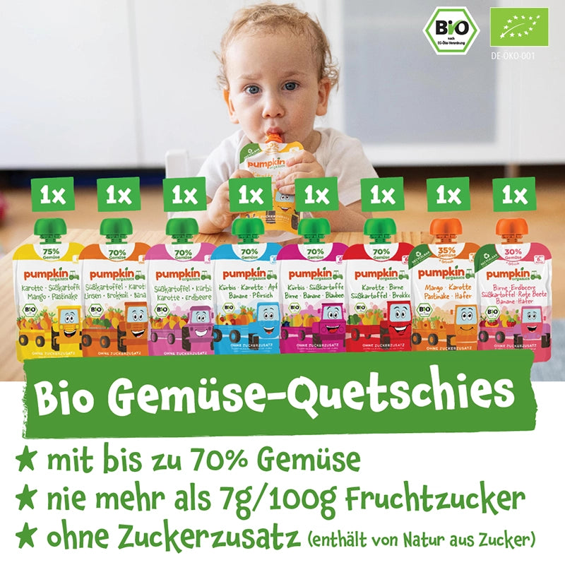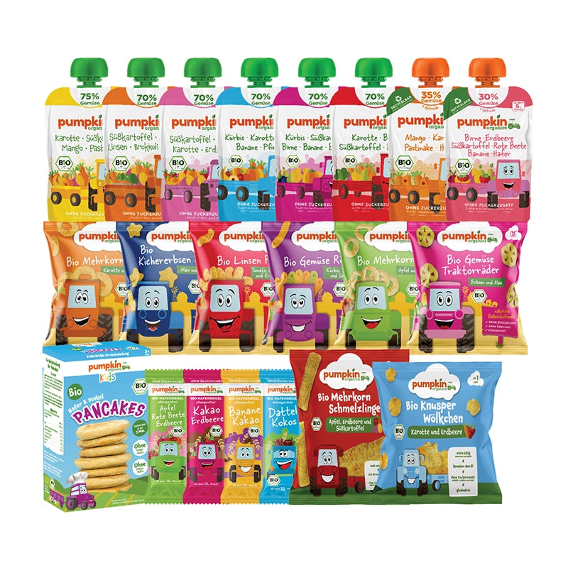 Unser Probierpaket nimmt Eltern und Kinder mit auf eine spannende Reise in die Welt des Gemüses. Bei Pumpkin Organics sind wir überzeugt: Eine Ernährung mit viel Gemüse und weniger Zucker ist der Schlüssel zu einer glücklichen Zukunft. Wir sind auf "Mission Gemüse" – um die nächste Generation Gemüse großzuziehen. Und deshalb haben wir das "Generation Gemüse" Probierpaket kreiert – die perfekte Gelegenheit, unsere Bio Gemüse-Quetschies, Knuspersnacks, Haferriegel und Pancakes einmal zu testen. Wir sind dein Partner für unterwegs, wenn Rote Beete, Süßkartoffel, Linsen und Co. nicht in die Tasche passen. So lecker kann Gemüse schmecken!