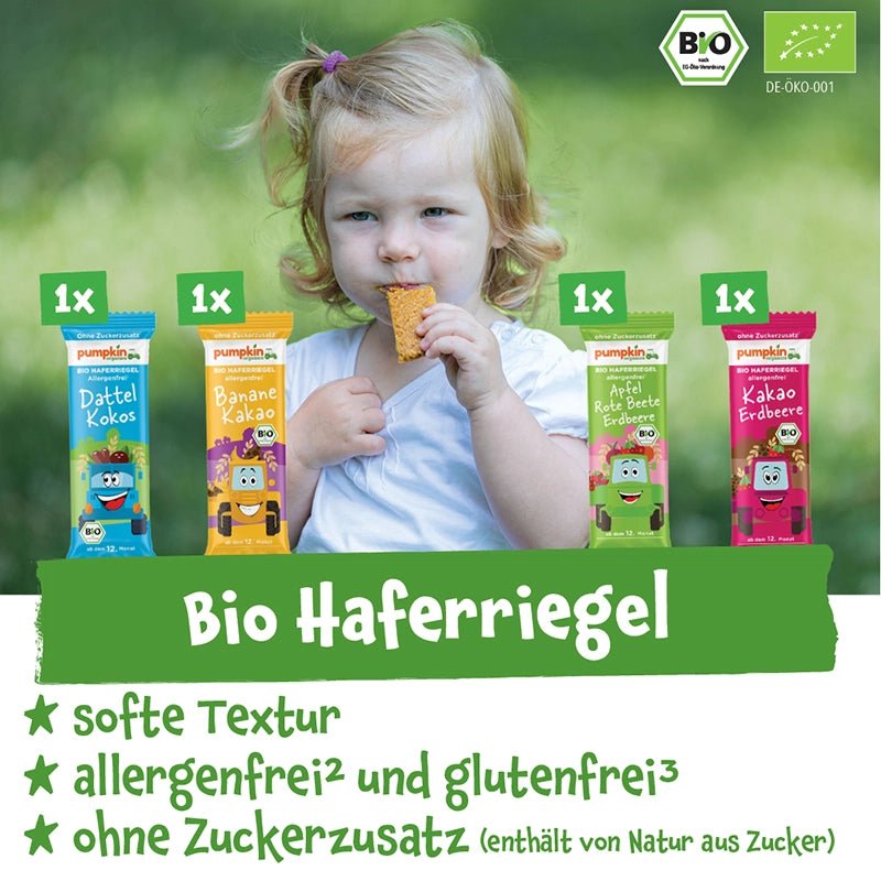 Die Bio Haferriegel von Pumpkin Organics sind der ideale Snack für unterwegs: Mit 38 % weniger Fruchtzucker und doppelt so vielen Ballaststoffen wie vergleichbare Produkte (siehe Vergleich). Die Riegel bestehen aus 100% Bio-Zutaten, sind gluten-³ und allergenfrei².