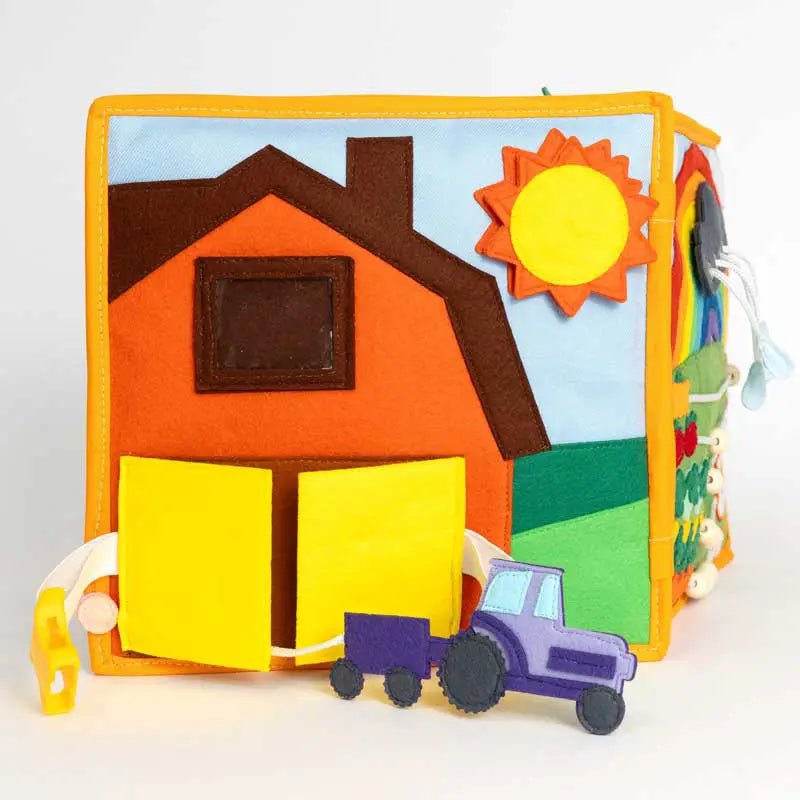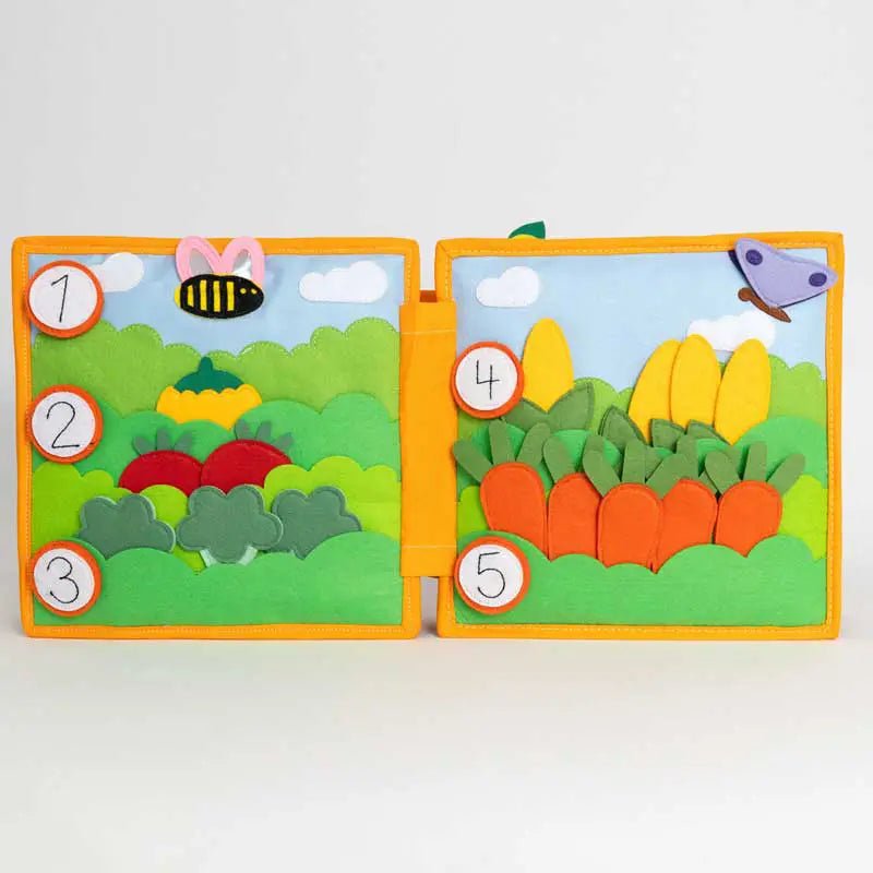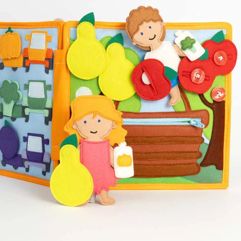 Quiet Books sind interaktive, kindgerechte Bücher, die pädagogisch wertvolle Möglichkeiten zur kreativen Beschäftigung und zum eigenständigen Lernen bieten. In diesem Quiet Book dreht sich alles um die Gemüsefarm. Jede Seite des Quiet Books ist ein neues Lernabenteuer mit Olivia und Max. Du zählst Brokkoli, Kürbisse, Süßkartoffeln, Mais und Karotten, während du sie aus dem Boden holst und farbenfrohes Gemüse den passenden Traktoren zuordnest. In einem wunderschönen Obstgarten sortierst du Äpfel und Birnen. Dabei erlebst du, wie leuchtendes Grün, tiefes Rot und sonniges Gelb die Gemüsefarm in einen Regenbogen gesunder Lebensmittel verwandeln. Durch diese unterhaltsamen, praktischen Aktivitäten werden wichtige Fähigkeiten wie Zählen, Zuordnen und das Erkennen von Farben gefördert, während du die Wunder der Natur entdeckst.